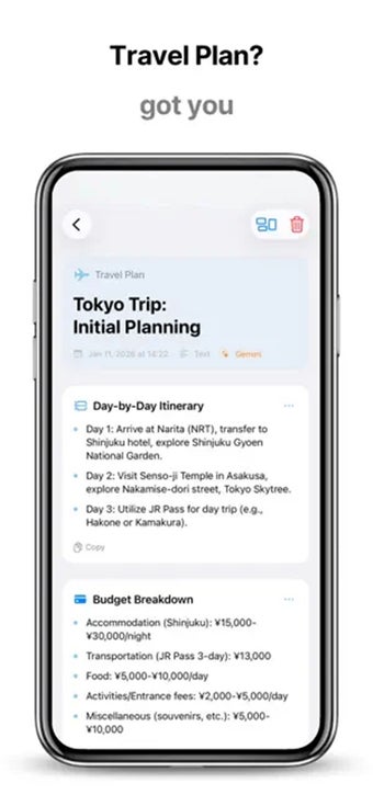Desde el momento en que introduces un pensamiento, Wiz Note AI: Smart Notes analiza y clasifica automáticamente en categorías relevantes. Ya sea una idea rápida, notas de una reunión o una foto de una pizarra, la interfaz transforma entradas desordenadas en secciones limpias con tarjetas conscientes del contexto que te ayudan a revisar y construir sobre la información.